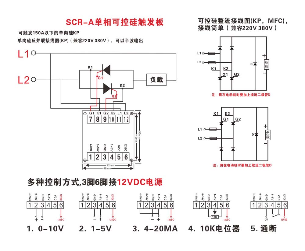 只要個信號:(多種控制信號輸入:DC 4-20mA、DC 1-5V、DC 0-10V、10k電位器),就能給出線性輸出,任意調溫調速調壓。可直接觸發150A以下的二只單向晶閘管。本控制板由進口高性能單片機作為控制、運算放大器、脈沖變壓器等單元組成??梢耘c各種自動化儀表配套使用,對儀表無干擾,也可以外接電位器手動控制,廣泛應用于負載要求連續平滑調節,擰制精度較高或不允許大電流沖擊的控制系統。如交直流電機調速、調壓、充電等。主要用于單相純阻性負載、單相感性負載或變壓器原邊控制,如硅碳棒、硅鉬棒、電阻絲等,也可用于單相或兩相全橋半控整流,具有觸發可靠,高精度,工作穩定,使用靈活的優點。