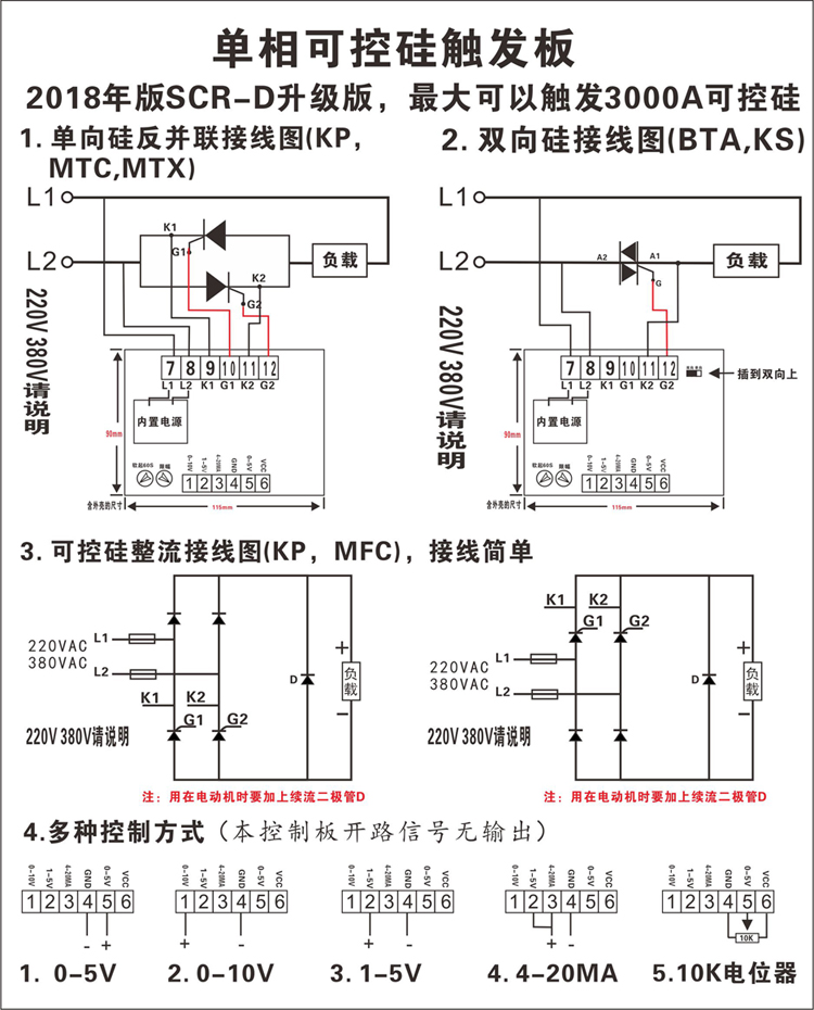 只要個信號:(多種控制信號輸入:DC 4-20mA、DC 1-5V、DC 0-10V、10k電位器),就能給出線性輸出,任意調溫調速調壓。可直接觸發2000A以下的二只單向晶閘管。本控制板由高性能單片機作為控制、運算放大器、脈沖變壓器等單元組成。可以與各種自動化儀表配套使用,對儀表無干擾,也可以外接電位器手動控制,廣泛應用于負載要求連續平滑調節,擰制精度較高或不允許大電流沖擊的控制系統。如交直流電機調速、調壓、充電等。主要用于單相純阻性負載、單相感性負載或變壓器原邊控制,如硅碳棒、硅鉬棒、電阻絲等,也可用于單相或兩相全橋半控整流,具有觸發可靠,高精度,工作穩定,使用靈活的優點。